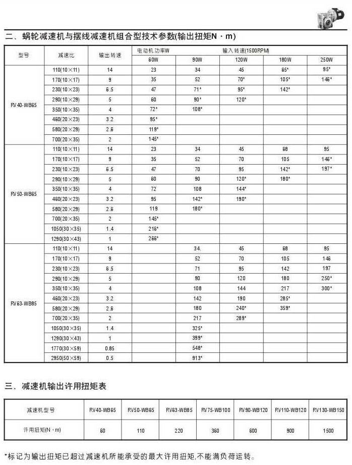 蝸輪減速機(jī)與WB系列擺線(xiàn)減速機(jī)組合型技術(shù)參數(shù)表(輸出扭矩N.M)一減速機(jī)輸出許用扭矩表