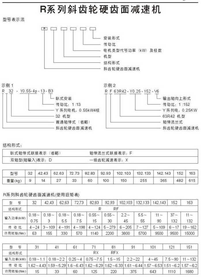 R系列斜齒輪硬齒面減速機型號表示法結(jié)構(gòu)形式使用扭矩表