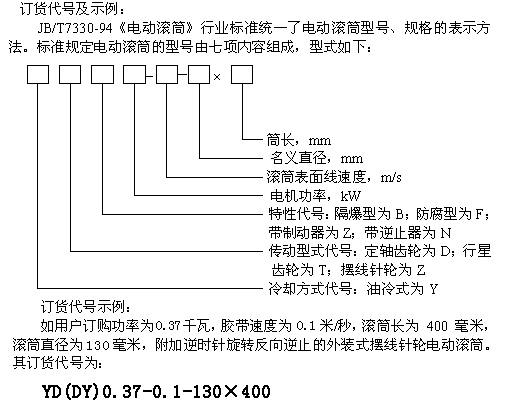 (2)用戶訂購(gòu)逆止電動(dòng)滾筒時(shí),須注明旋轉(zhuǎn)方向,如不注明則為任意方向。其表示方法為在特性代號(hào)后加“S”(表示在電機(jī)引出線一側(cè)觀察,端蓋應(yīng)順時(shí)針旋轉(zhuǎn))或“N”(表示在電機(jī)引出線一側(cè)觀察,端蓋應(yīng)逆時(shí)針旋轉(zhuǎn))。